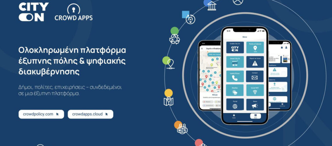 Η πλατφόρμα City On & Crowdapps cloud παρέχει στους πολίτες ένα ολοκληρωμένο ψηφιακό περιβάλλον διακυβέρνησης, διαβούλευσης, ενημέρωσης και συμμετοχής, το οποίο αξιοποιεί και τις δυνατότητες της Τεχνητής Νοημοσύνης.