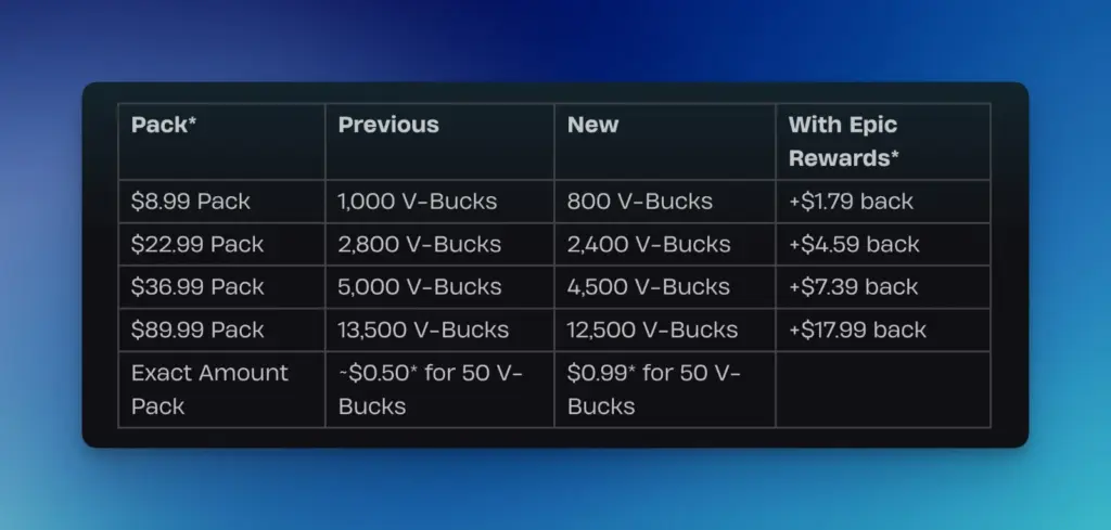 Παράλληλα, αυξάνεται και η τιμολόγηση των πακέτων ακριβούς ποσότητας. Η τιμή ανεβαίνει από 0,50 δολάρια ανά 50 V-bucks σε 0,99 δολάρια ανά 50 V-bucks, μεταβάλλοντας το κόστος για όσους επιλέγουν μικρότερες αγορές ή συμπληρωματικές μονάδες.