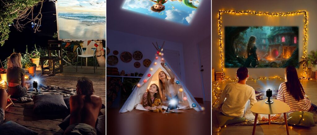 Παρά το μικρό του μέγεθος, προβάλλει εικόνα έως και 100 ίντσες σε σχεδόν κάθε επίπεδη επιφάνεια. Η ρυθμιζόμενη βάση που περιλαμβάνεται διευκολύνει την κλίση και γωνία — ιδανική για προβολή στο ταβάνι ή από το πάτωμα στον τοίχο. Δεν απαιτούνται εργαλεία, τρίποδα ή επιπλέον εξοπλισμός.