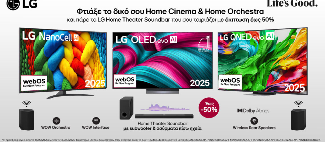 Η LG Electronics (LG) παρουσιάζει μία ξεχωριστή προωθητική ενέργεια που προσκαλεί τους καταναλωτές να αναβαθμίσουν την εμπειρία ψυχαγωγίας στο σπίτι τους. Από 15 έως και 30 Σεπτεμβρίου 2025, με την αγορά επιλεγμένων τηλεοράσεων LG, οι καταναλωτές μπορούν να αποκτήσουν το LG HomeTheater Soundbar που τους ταιριάζει με έκπτωση έως και 50%.