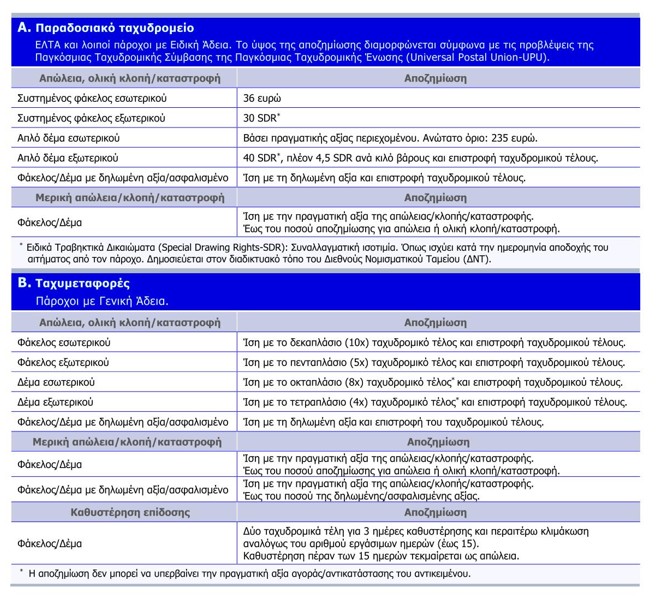 - Στην απόφαση προβλέπονται πλέον διαφορετικές περιπτώσεις αποζημίωσης για ταχυμεταφορές και παραδοσιακό ταχυδρομείο. Ακολουθεί συνοπτική παρουσίαση των κυριότερων περιπτώσεων.