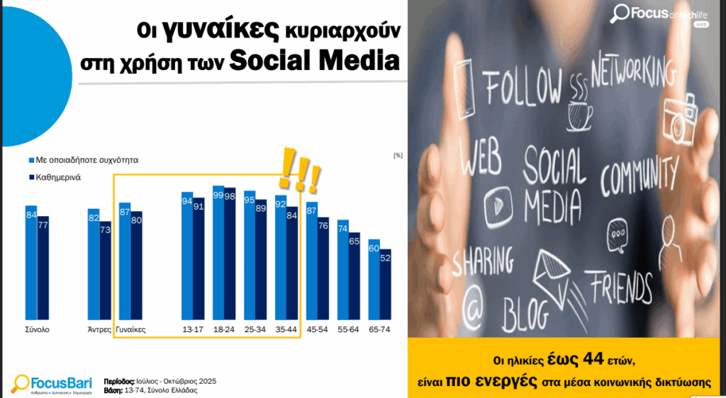 Στο μεταξύ, σύμφωνα με την έρευνα, η κοινωνική δικτύωση παραμένει απόλυτος κυρίαρχος της ψηφιακής δραστηριότητας. Οι γυναίκες αποτελούν την πιο ενεργή ομάδα χρηστών, με ποσοστά που ξεπερνούν εκείνα των ανδρών τόσο στη γενική, όσο και στην καθημερινή χρήση.