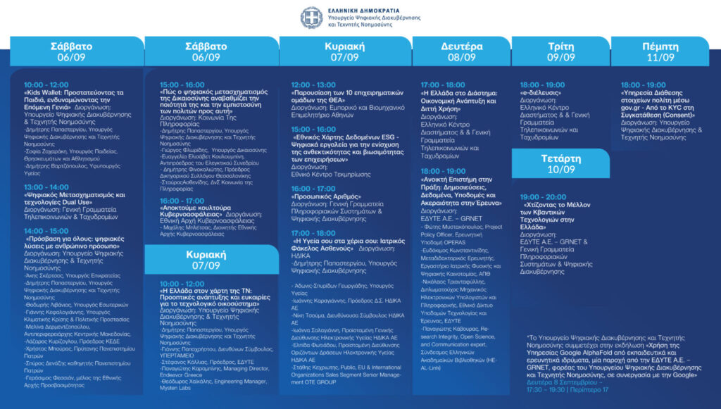 Επίσης, οι επισκέπτες θα ενημερωθούν για τις πρωτοβουλίες αναβάθμισης του επιπέδου Κυβερνοασφάλειας και την εφαρμογή της Οδηγίας NIS2, τη διείσδυση της ευρυζωνικότητας στα νοικοκυριά και τις επιχειρήσεις όλης της Ελλάδας με τα Προγράμματα Gigabit Voucher και Smart Readiness, καθώς και την πορεία των έργων του «Προγράμματος Ψηφιακός Μετασχηματισμός 2021-2027» του ΕΣΠΑ.