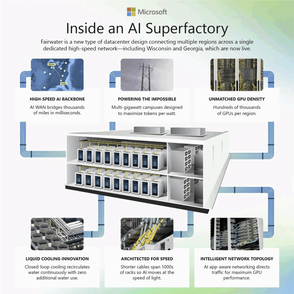 Ο νέος αυτός σχεδιασμός, ο οποίος φέρει την ονομασία Fairwater, βασίζεται στη σύνδεση δύο μεγάλων datacenters —στο Wisconsin και στην Atlanta— με ένα αποκλειστικό δίκτυο οπτικών ινών που μεταφέρει εκπαιδευτικά δεδομένα σε ταχύτητες που απαιτούνται για να παραμείνουν εκατοντάδες χιλιάδες GPU ενεργές χωρίς διακοπές. Η Microsoft περιγράφει το σύστημα αυτό ως θεμέλιο για την επόμενη εποχή της AI, όπου η συνεχής ροή δεδομένων θα είναι το ίδιο κρίσιμη όσο και η ίδια η υπολογιστική ισχύς.