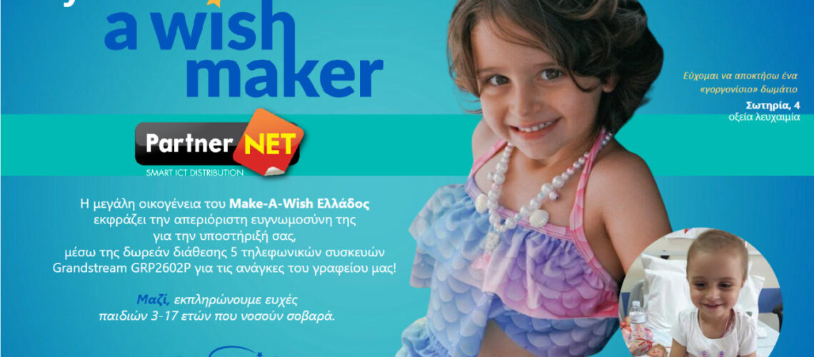 Η PartnerNET, σε συνεργασία με τη Grandstream, εκφράζει την υποστήριξή της στο έργο του Make-A-Wish (Κάνε-Μια-Ευχή Ελλάδος), του οργανισμού που χαρίζει ελπίδα και χαμόγελα σε παιδιά που παλεύουν με σοβαρές ασθένειες.