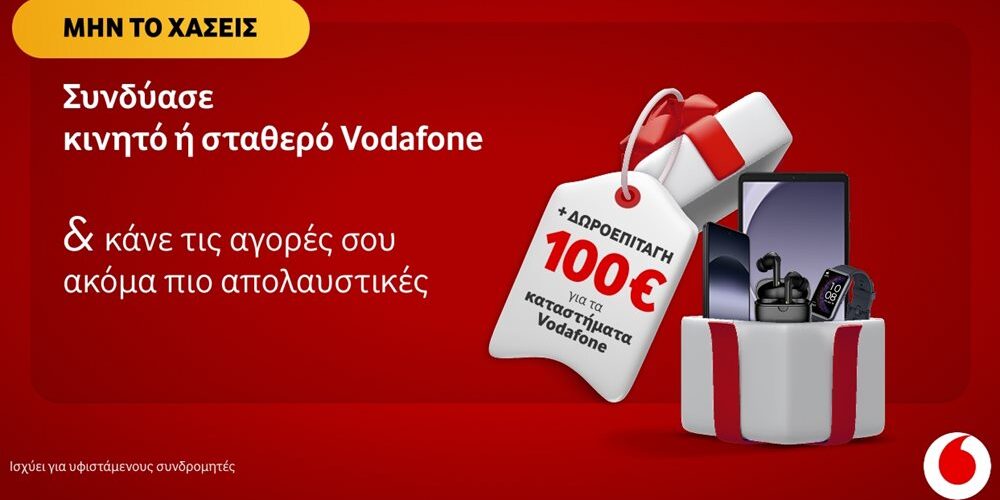 Παράλληλα, τη δωροεπιταγή αξίας 100€ μπορούν να αποκτήσουν και όσοι πελάτες Vodafone διαθέτουν συνδυαστικό πακέτο σύνδεσης σταθερής και κινητής και επιθυμούν να αποκτήσουν μία επιπλέον σύνδεση κινητής RED Unlimited με 22,04€ για τους πρώτους 12 μήνες ή νέα σύνδεση σταθερής Full Fiber 300 Plus με 20€ για τους πρώτους 12 μήνες.