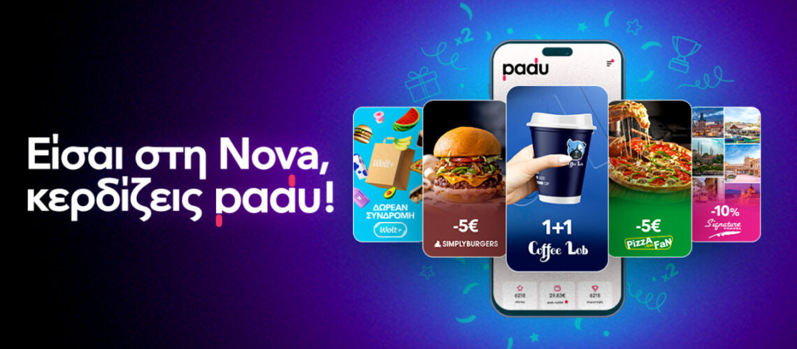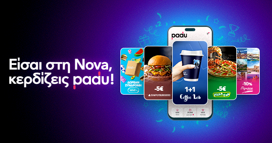 - Ακόμη περισσότερα exclusive Nova Deals, με πρόσβαση σε 1.000+ σημεία εξαργύρωσης σε όλη την Ελλάδα, μέσω της συνεργασίας με το padu.