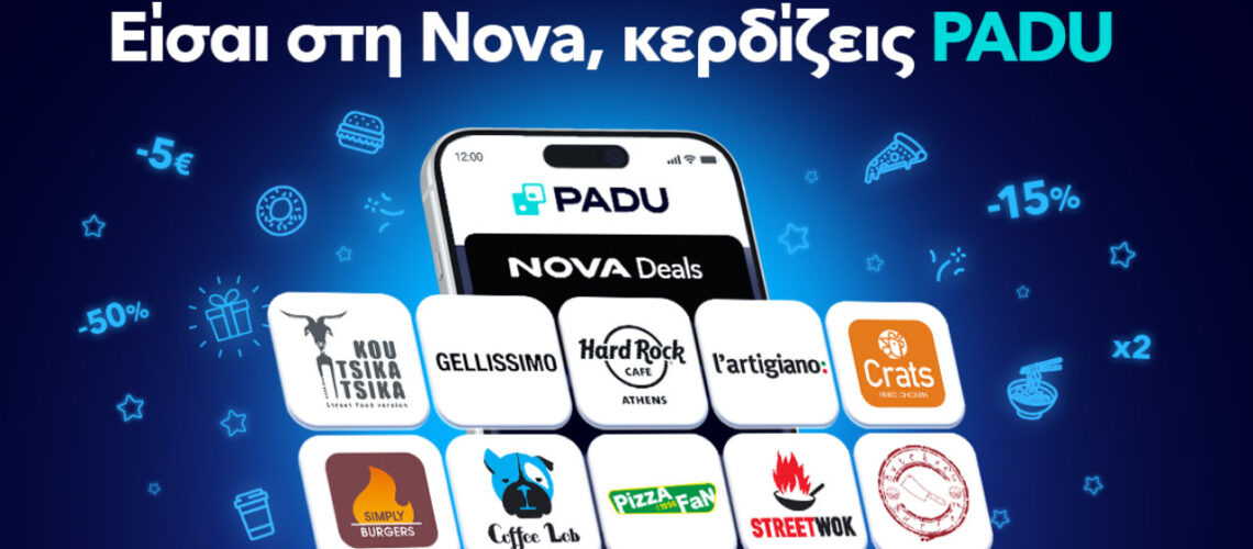 Η Nova ενισχύει περαιτέρω την εμπειρία επιβράβευσης των συνδρομητών της, μέσα από τη συνεργασία της με το PADU, προσφέροντας ακόμη μεγαλύτερη αξία στην καθημερινότητά τους, με αποκλειστικές εκπτώσεις και μοναδικά deals σε αγαπημένα brands φαγητού και καφέ.