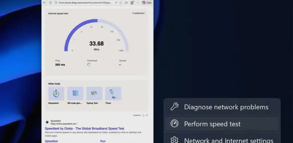 Από τα τέλη του 2023, το Speedtest ήταν ήδη ενσωματωμένο στη μηχανή αναζήτησης Bing, δίνοντας τη δυνατότητα εκτέλεσης τεστ μέσα από το search. Η τρέχουσα επέκταση φέρνει το ίδιο εργαλείο ακόμα πιο κοντά στον τελικό χρήστη, μεταφέροντάς το στο ίδιο το λειτουργικό σύστημα. Η λειτουργία καλύπτει τόσο ενσύρματες και Wi-Fi συνδέσεις όσο και cellular, συμπεριλαμβανομένων laptops με ενσωματωμένο modem.