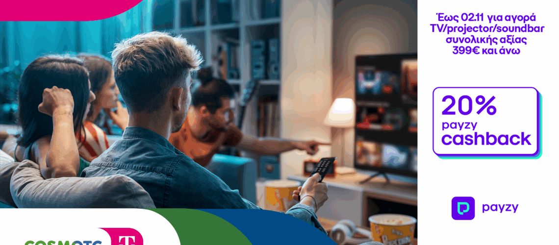 20% επιστροφή της αξίας των αγορών τους σε ευρώ (cashback) κερδίζουν οι καταναλωτές που θα αποκτήσουν με κάρτα payzy, έξυπνες τηλεοράσεις, projector και soundbar στα καταστήματα της COSMOTE TELEKOM και ΓΕΡΜΑΝΟΣσε όλη την Ελλάδα αλλά και στα cosmote.gr και germanos.gr. Η προσφορά ισχύει μέχρι και τις 2 Νοεμβρίου για αγορές συνολικής τελικής αξίας, ανά συναλλαγή, 399€ και άνω[1].