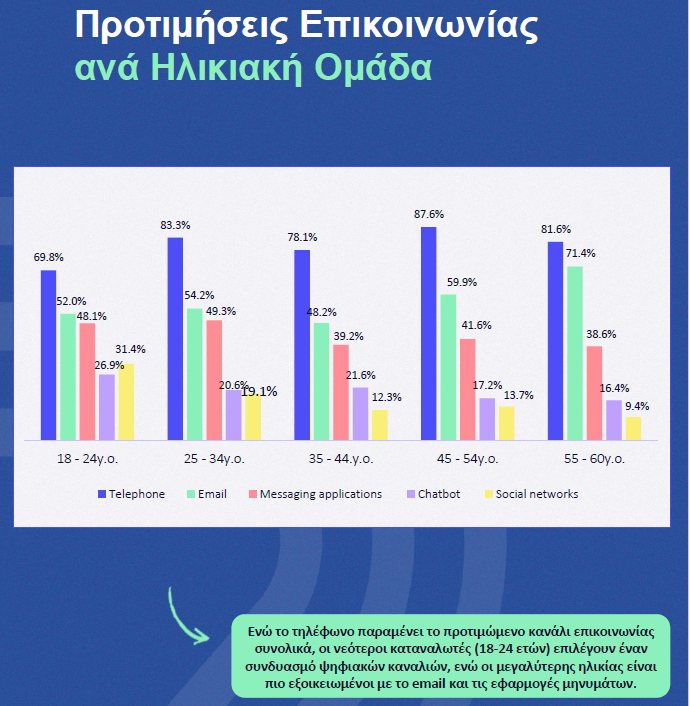 Ωστόσο, οι νεότερες ηλικίες δείχνουν πιο δεκτικές. Στην ομάδα 18-24 ετών, το 35% αναγνωρίζει ότι η AI επιταχύνει τις διαδικασίες και 41% βλέπουν θετικά τη συμβολή της τεχνολογίας στη βελτίωση της ποιότητας εξυπηρέτησης. Αυτό δείχνει ότι η αλλαγή κουλτούρας έχει ξεκινήσει – αλλά προϋποθέτει ουσιαστικές βελτιώσεις στη λειτουργικότητα και την κατανόηση των συστημάτων.