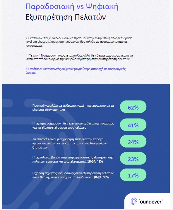 Η σχετική έρευνα υπογραμμίζει ότι η AI στην εξυπηρέτηση πελατών δεν απορρίπτεται, απλώς καλείται να αποδείξει την αξία της, καθώς οι Έλληνες συνεχίζουν και σήμερα να αναζητούν μια ανθρώπινη φωνή για την εξυπηρέτησή τους και όχι έναν βοηθό τεχνητής νοημοσύνης.