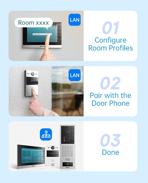 με δύο μόνο βήματα —διαμόρφωση του προφίλ δωματίου και συγχρονισμός με το door phone— ενεργοποιούνται οι λειτουργίες κλήσης, ξεκλειδώματος και παρακολούθησης.