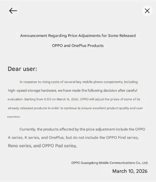 H Oppo προέβη σε σημαντική ανακοίνωση σύμφωνα με το gιzmochina πριν από λίγη ώρα τονίζοντας ότι θα αυξήσει τις τιμές των smartphone της από τις 16 Μαρτίου. Το μέτρο ισχύει και για τα OnePlus κινητά. Αιτία, σύμφωνα με την εταιρεία, είναι το αυξημένο κόστος των εξαρτημάτων λόγω της AI, ενώ τα μόνα τηλέφωνα τα οποία δεν επηρεάζονται από αυτές τις αυξήσεις είναι τα Oppo Find και Reno.