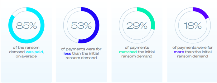 Από τους οργανισμούς που συμμετείχαν στην έρευνα, οι 826 οργανισμοί που κατέβαλαν λύτρα γνωστοποίησαν τόσο την αρχική απαίτηση όσο και την πραγματική πληρωμή, αποκαλύπτοντας ότι κατέβαλαν, κατά μέσο όρο, το 85% της αρχικής απαίτησης σε λύτρα. Συνολικά, το 53% πλήρωσε λιγότερα χρήματα από το αρχικό αίτημα, το 18% πλήρωσε περισσότερα και το 29% αντιστοιχεί σε πληρωμές που ανταποκρίνονται στο αρχικό αίτημα.