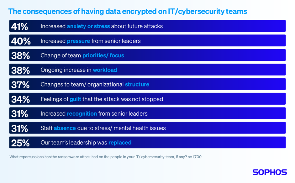 Η κρυπτογράφηση δεδομένων σε μια επίθεση ransomware έχει σημαντικές επιπτώσεις για την ομάδα πληροφορικής/ κυβερνοασφαλείας μίας επιχείρησης, με όλους τους ερωτηθέντες να δηλώνουν ότι η ομάδα τους επηρεάστηκε κατά κάποιον τρόπο.