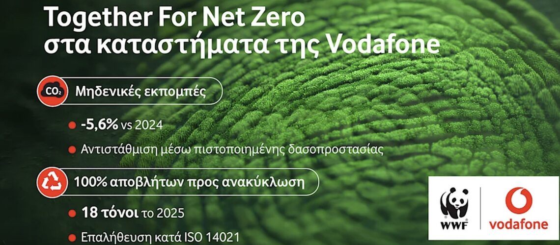 Το ανθρακικό αποτύπωμα των καταστημάτων της Vodafone για το 2025 διαμορφώθηκε στους 67 τόνους CO₂, παρουσιάζοντας μείωση 5,6% σε σχέση με το προηγούμενο έτος. Οι συνολικές εκπομπές αντισταθμίστηκαν μέσω ενός διεθνώς πιστοποιημένου έργου προστασίας δασών, με αποτέλεσμα το δίκτυο των ιδιόκτητων καταστημάτων να επιτύχει μηδενικές καθαρές εκπομπές (net zero).
