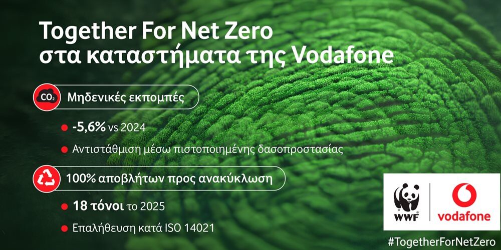 Στο πλαίσιο της πρωτοβουλίας Together for Net Zero και σε συνεργασία με το WWF, η Vodafone Ελλάδας επεκτείνει την εφαρμογή της zero waste πολιτικής της, σε ολόκληρη την αλυσίδα των ιδιόκτητων καταστημάτων της. Έτσι, διασφαλίζει ότι το 100% των ανακυκλώσιμων αποβλήτων των καταστημάτων της συλλέγεται ξεχωριστά, δεν καταλήγει σε σύμμεικτα απορρίμματα και οδηγείται αποκλειστικά σε διαδικασίες ανακύκλωσης, ή ανάκτησης.